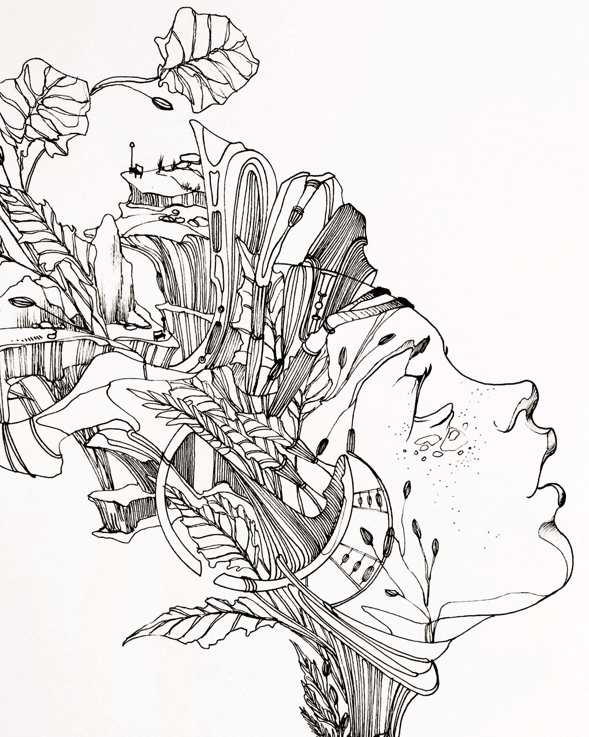Pen and Ink is the most raw form of my hand. It is the most evident form of the method I use called “Automatic Drawing”. Similar to my paintings, the girls done with pen and ink are done without preplanning. However, with this smaller point on the tool, it requires a lot more control for every line to stay smooth and grounded. At the same time, it shows my vulnerable hands, it’s depth in strength, and acts as an imprint of my exact thoughts.