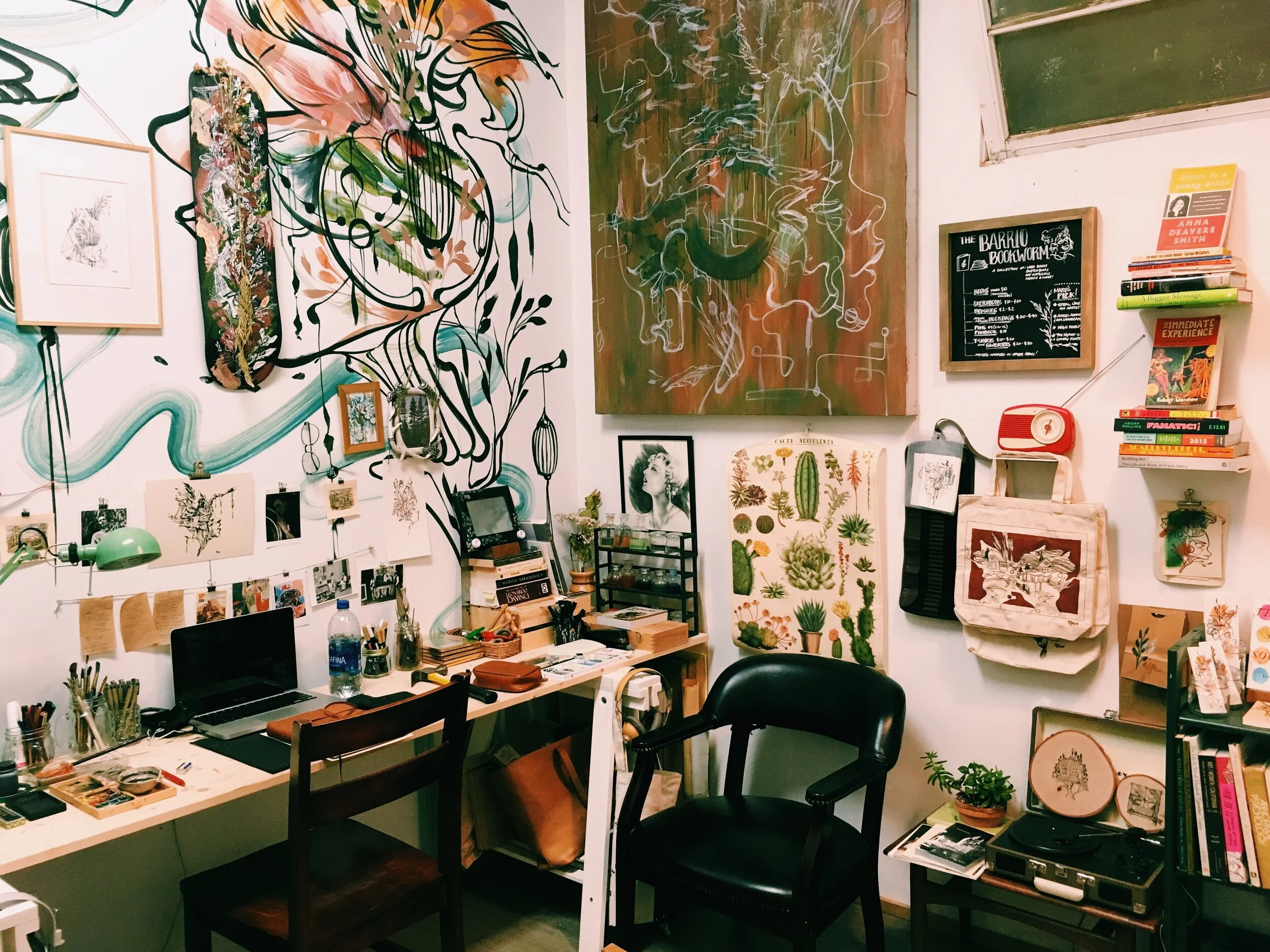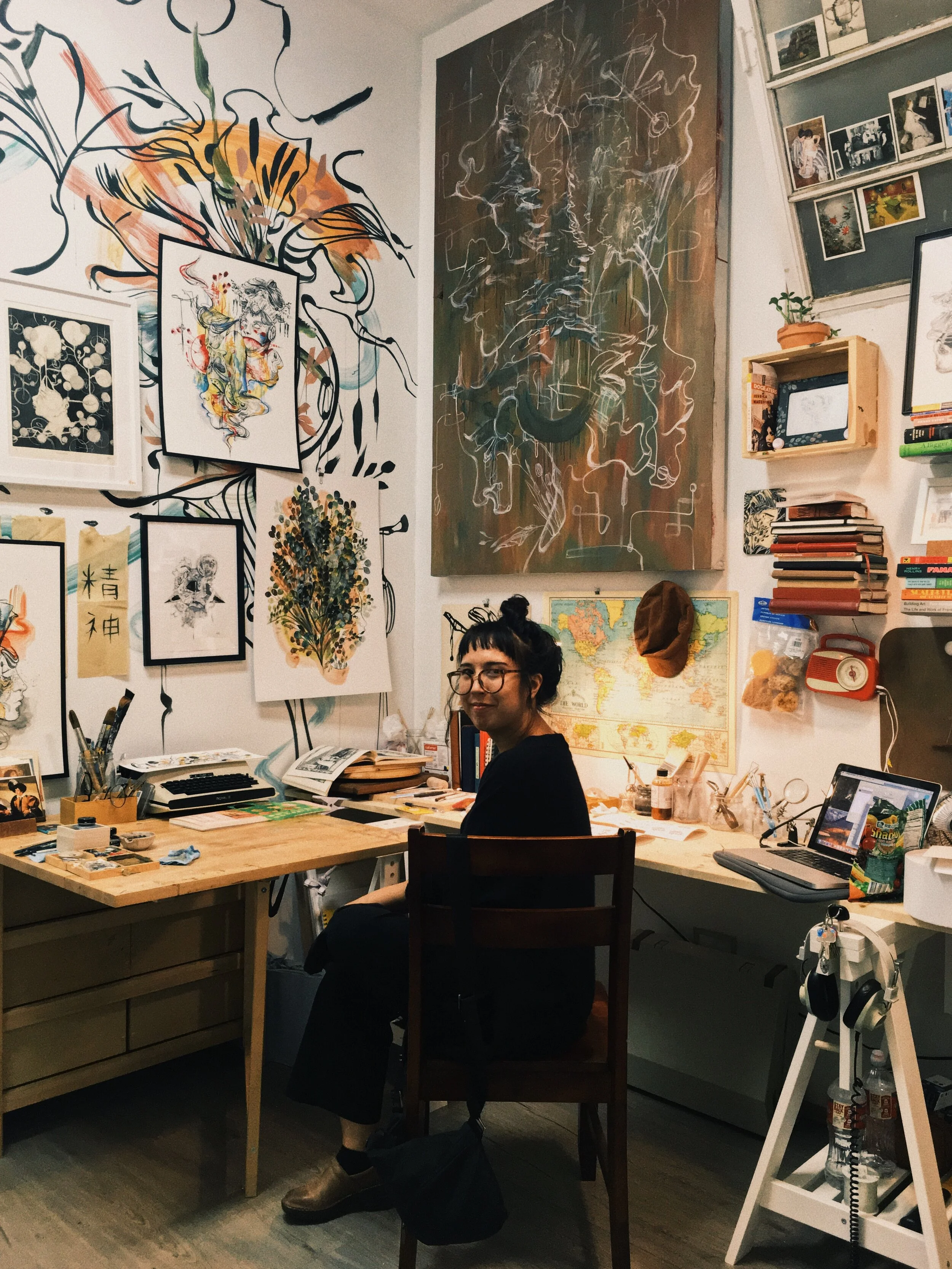Portraits from 2018 - Current of the artist in her previous home studio, public spaces, and current studios.